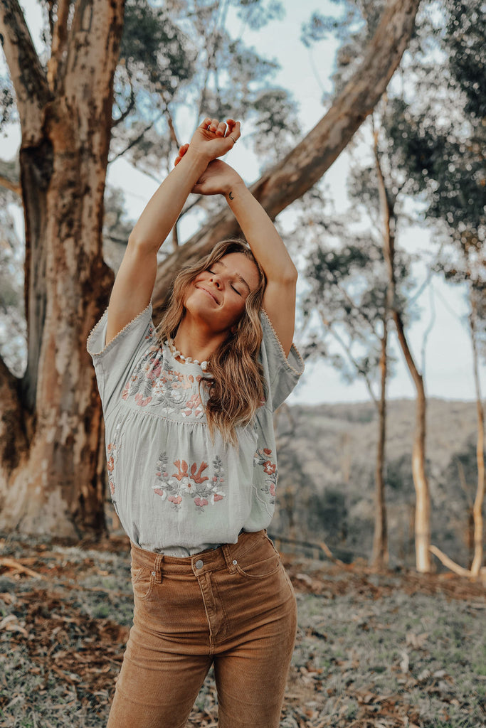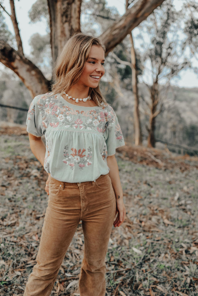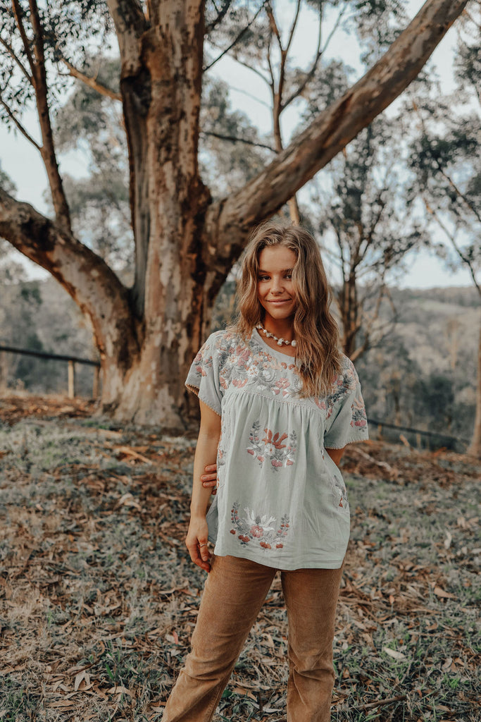 Inspired by vintage Mexican Botanical designs, this gorgeous statement blouse is a collectable gem for your wardrobe. Folkstore folk blouse in ethereal Seamist. Short sleeve relaxed fit in a soft mint green coloured light cotton, featuring delicate hand embroidery in pretty pastel tones. These are all individually hand made and may vary slightly from the one pictured.