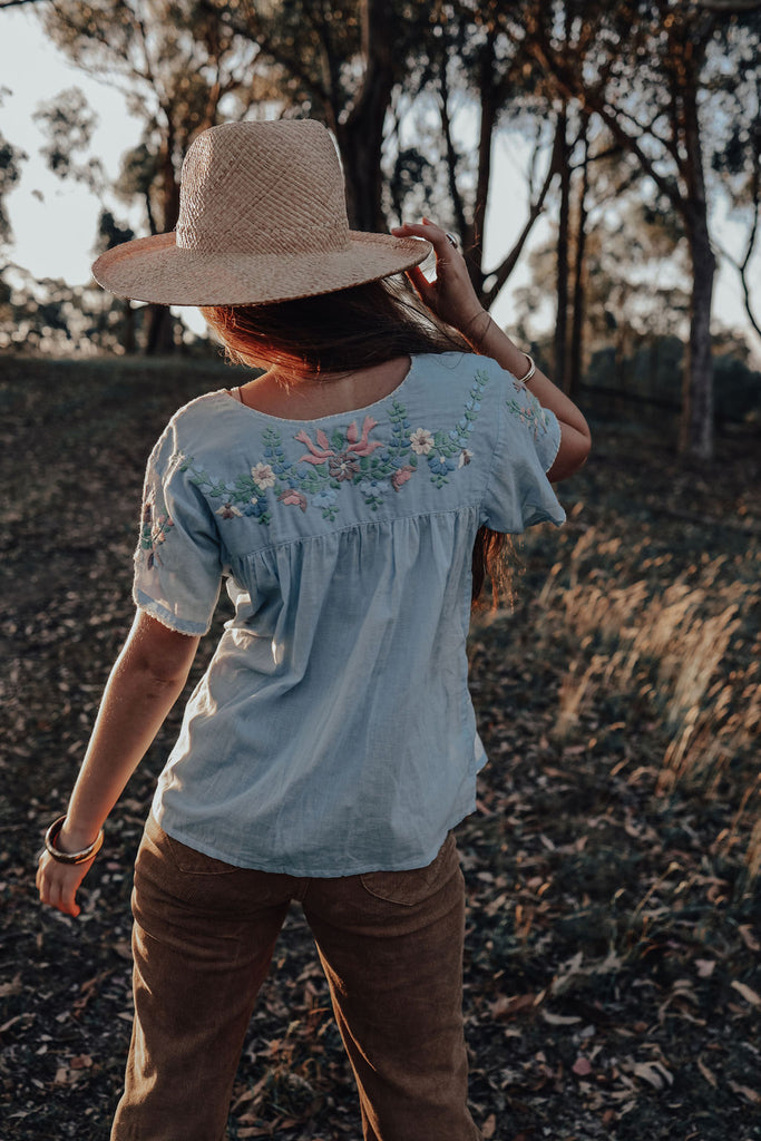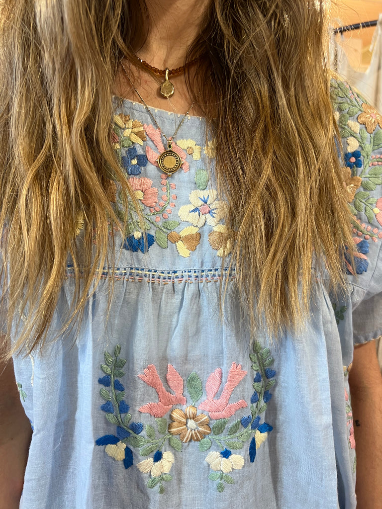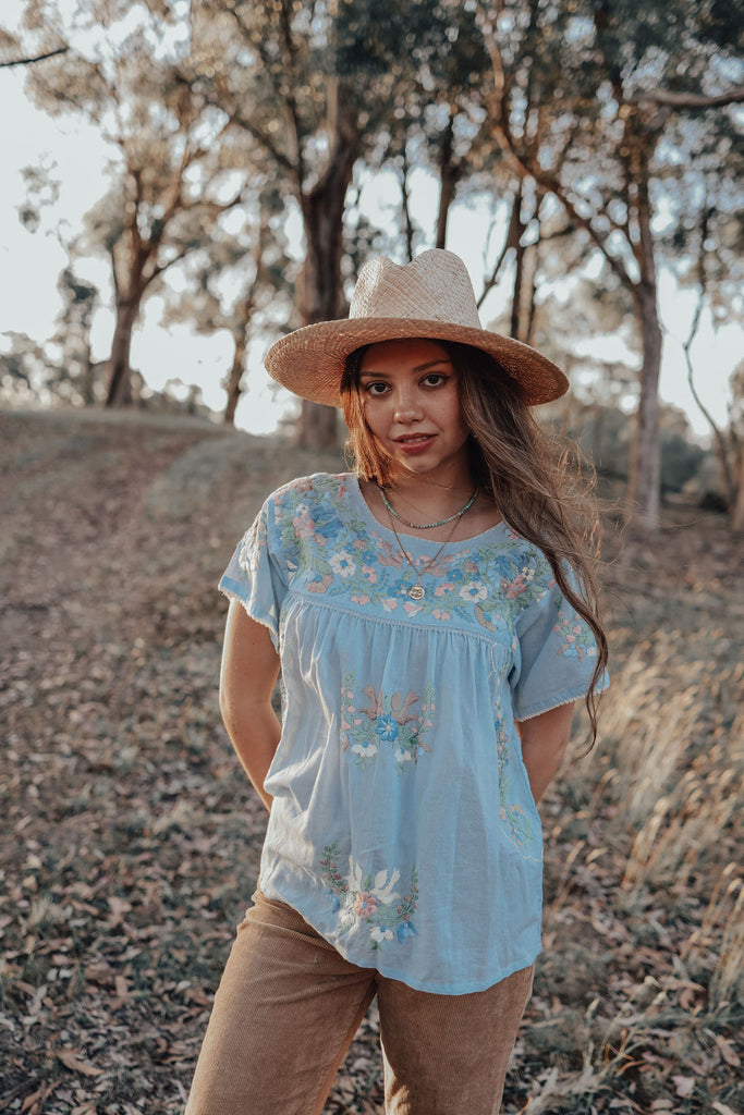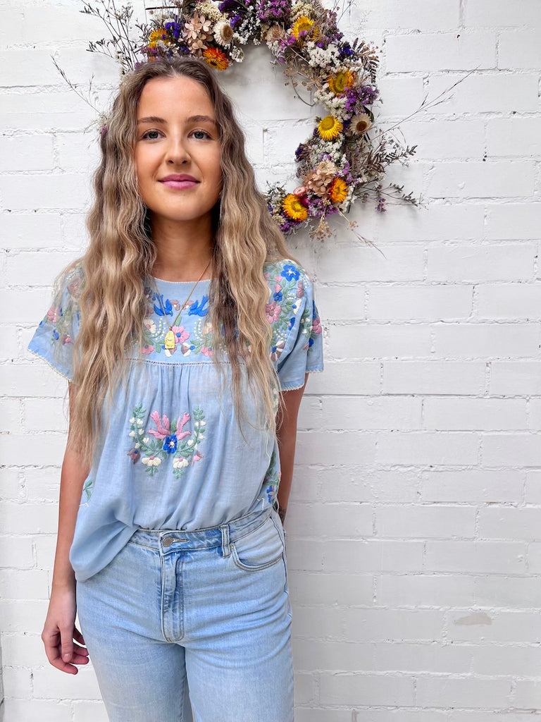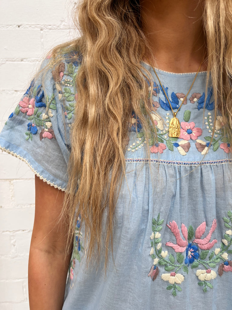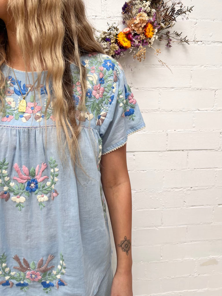 Inspired by Mexican peasant embroidery, our Folk blouse is one of our favourite styles.New Pastel Blue color with pretty pastel embroidery. Short sleeve relaxed fit in a pale blue coloured light cotton, featuring delicate hand embroidery. These are all individually hand made and may vary slightly from the one pictured.