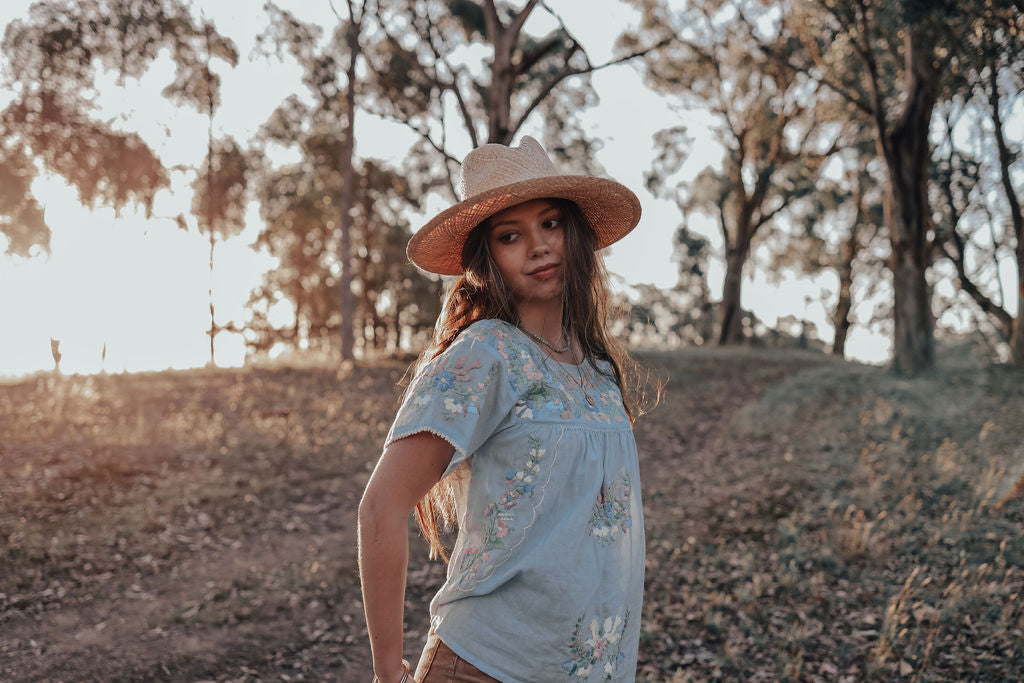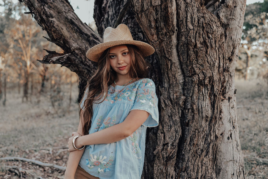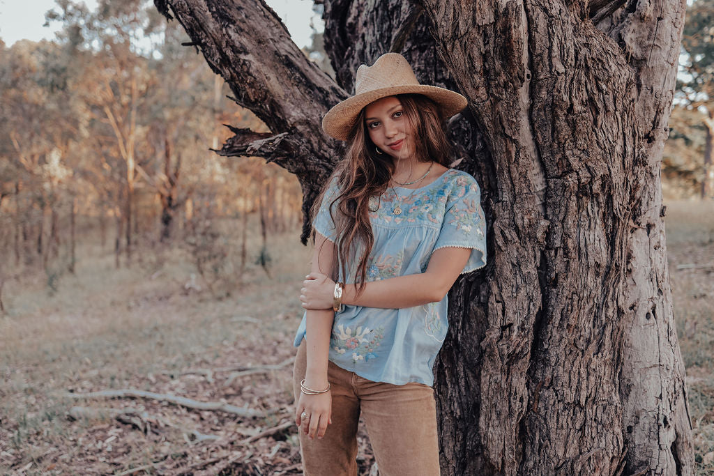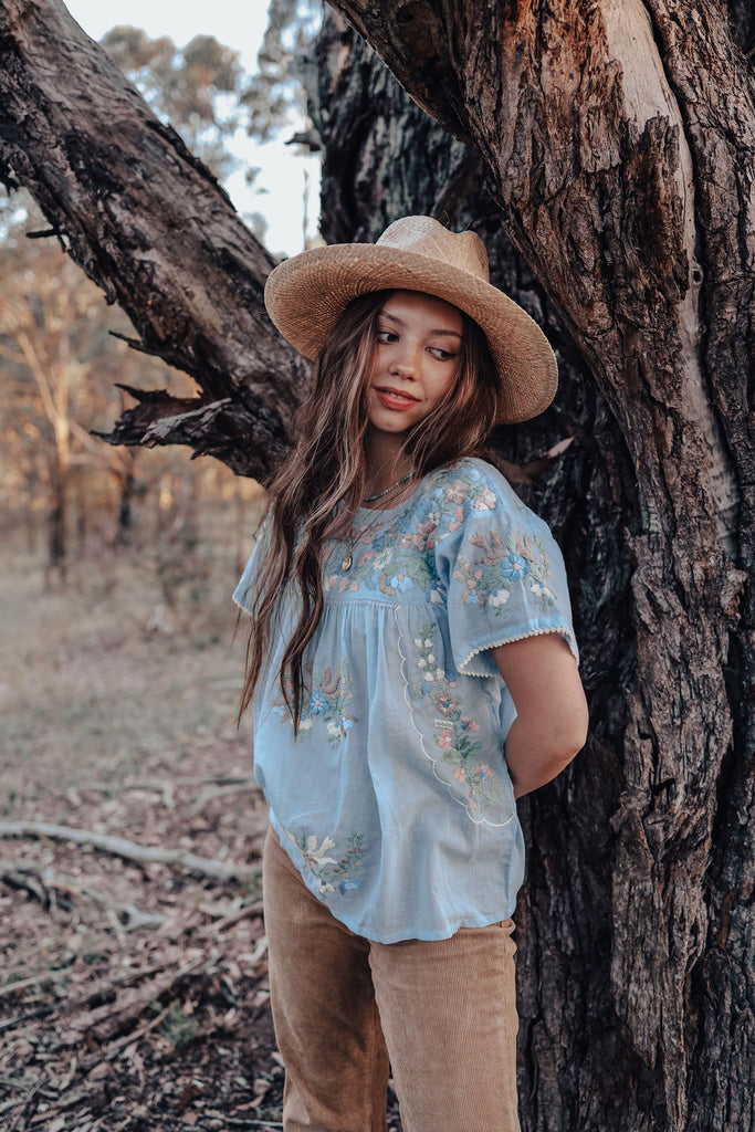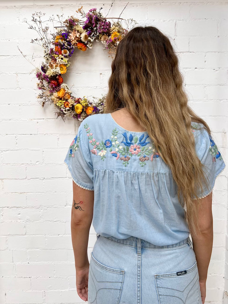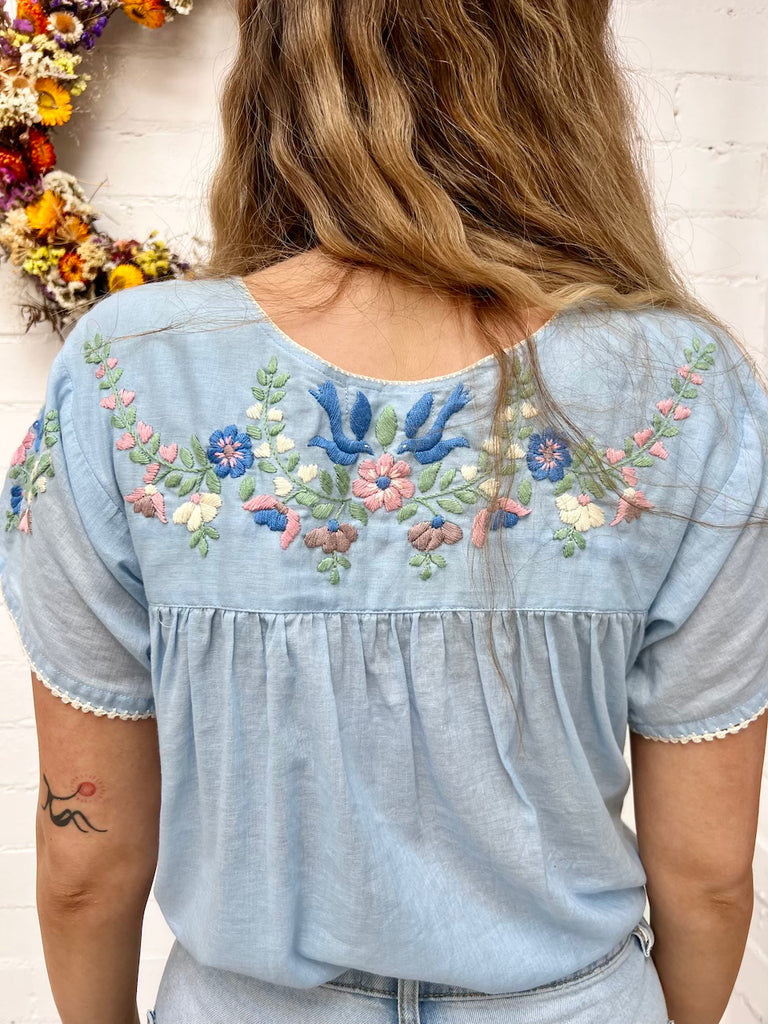 Inspired by Mexican peasant embroidery, our Folk blouse is one of our favourite styles.New Pastel Blue color with pretty pastel embroidery. Short sleeve relaxed fit in a pale blue coloured light cotton, featuring delicate hand embroidery. These are all individually hand made and may vary slightly from the one pictured.